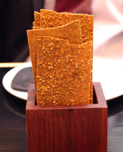 Instead of the usual baguette or other artisan bread, dinner here starts with buckwheat lavash imbued with nori and sesame seeds. Paper-thin, they have the flavor of brown bread and the aroma of an umami bomb.