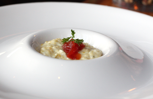 An amuse arrived — a large plate with a small crater in the center, cradling thick, rustic grits with tomato marmalade and blue cheese. It had nice balance, because even with the addition of the pungent cheese, you could still taste the lovely sweet corn flavor of the grits.