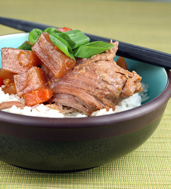 After browning a boneless pork shoulder roast in a Dutch oven, carrots, shallots and daikon radish were added, along with the contents of the 16-ounce jar of Clay Pot Cooking Sauce and two cups of water. Put a lid on and allow to braise in the oven for three hours. Then, serve with bowls of fluffy, steamed rice.