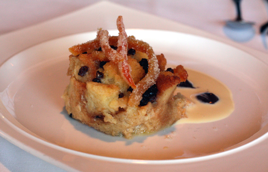 Dessert brought a warm, buttery bread pudding ($9), studded with currants and candied orange peel. Other bread puddings may be so dense that they sit in your stomach like a brick. This one was pleasantly fluffy, custardy and just the right size to satisfy.