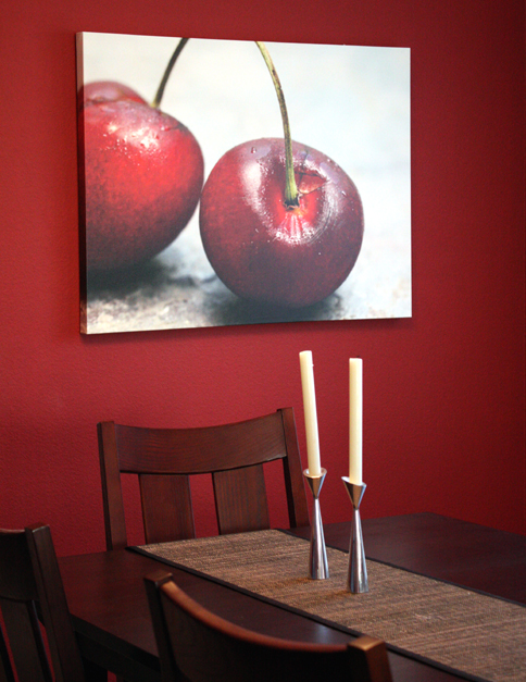 I chose my photo of cherries because I liked the simplicity of the image. It’s not so fussy that I’d get tired of looking at it quickly. And when enlarged to that scale, it has a real presence in the room. Plus, it matched my deep red dining room walls so well.