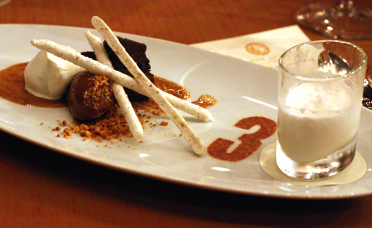 Dessert brought a deconstructed version of the resort’s famous “Auberge Torte au Chocolat,” made up of hazelnut dacquoise, chocolate cremeux, hazelnuts and dark chocolate ganache. Rather than a slice of torte, there were several separate components on the plate, which, when eaten together provided the same over-the-top decadence. A stencil of cocoa powder alongside a tiny glass of ice milk cleverly “spelled out” the number “30” on the plate.