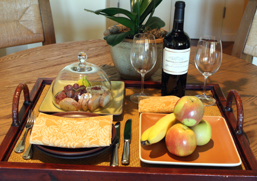 Fabulous! Not only the food, but that room. Oh my. And the beautifully-presented tray of fruit, wine and cheese! Perfect!
