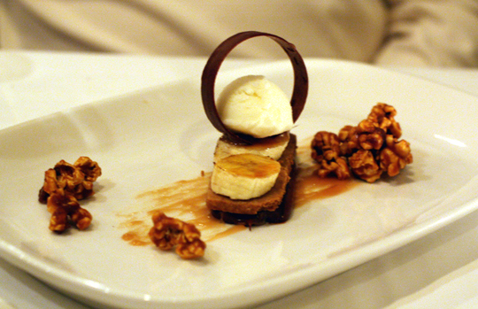 For dessert, he chose the whimsical “Chocolate Popcorn,” which featured popcorn sorbet, caramelized banana slices, Valrhona chocolate cream and caramel corn so fresh you wish you could get it that way at the movie theater. It was as much fun as it sounds, too.