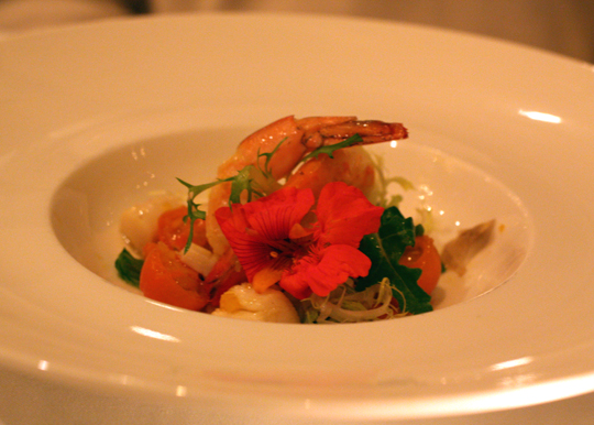 Calamari, shrimp and scallops with heirloom tomatoes and arugula.