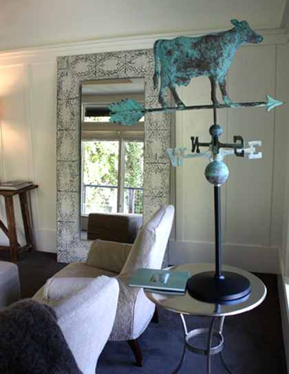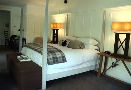 We stayed in an upstairs suite in the newly built barn at the back of the property. The suite definitely has a rustic vibe — but one attuned to Ralph Lauren.  Bright, airy and chic, the suite featured a four-poster bed adorned with a pillow decorated with a black cat in homage to Charlotte, of course. A double-sided stone gas fireplace sat across from the bed and could be enjoyed from the other side outside on the deck, too. The bathroom featured a jetted tub, separate steam shower and radiant heat floors to toast your tootsies on chilly mornings.