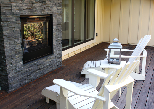 The room's double-sided fireplace can be enjoyed from the deck, too.