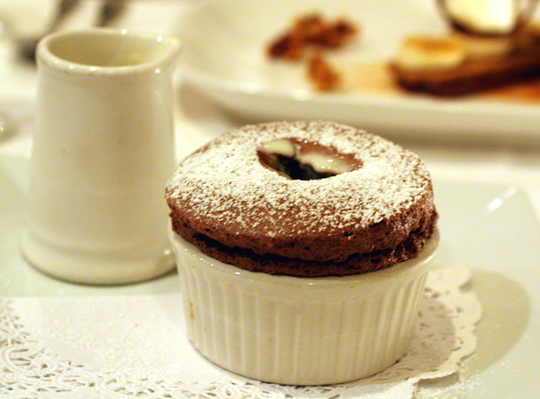 Our server took the liberty of bringing us a Valrhona chocolate souffle, too. And really, who is going to turn down a souffle when it’s brought to the table, right? It was warm and airy as a cloud.  Take your spoon and poke a hole in the top to pour in the accompanying bourbon creme anglaise — and prepare to sigh deeply.