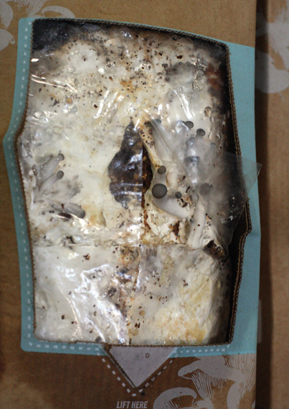 The kits couldn’t be easier to use. Open the flap on the box, cut open the plastic bag and mist the coffee grounds twice daily with water. In about 10 days, you’ll have a pound of oyster mushrooms to enjoy. Flip the box over. Repeat process. And you’ll get another crop. Afterward, the grounds can be used in your backyard soil to make your garden flourish.