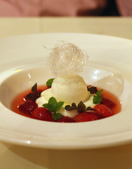 Dessert also proved a high point. Kula “Strawberries Romanoff” makes use of locally made goat cheese in a silky panna cotta floating in a refreshing strawberry-hibiscus consomme and topped with tangy goat cheese sorbet.