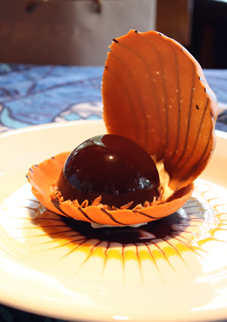 Dinner ends appropriately enough with a little dish of chocolate-covered macadamia nuts.