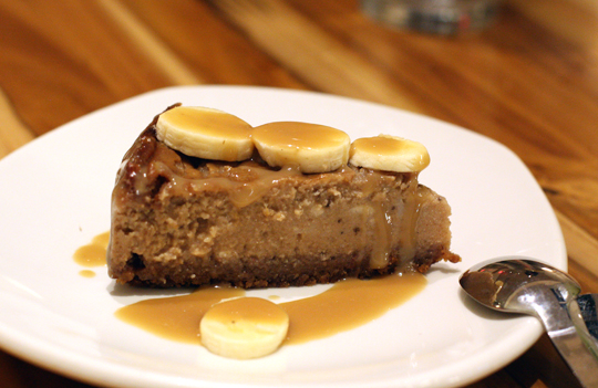 The vegan banana-rum cheesecake ($3.99) tastes of the tropics. It’s super creamy, with a pecan crust and a caramel rum sauce over the top.