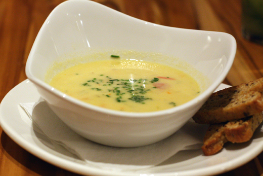 Sweet corn chowder ($3.99) gets its creamy body from cashew cream. It’s redolent of corn flavor, but lighter in body than the traditional version made with heavy cream. A garnish of of multigrain croutons adds a nice crunch.