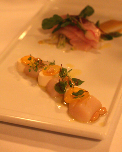 Dinner began with a duo of crudo on one plate: At one end, Mantuano’s raw Nantucket Bay Scallops with celery root, Meyer lemon, shaved mandarinquats and Tuscan pine nuts; at the other end, Terje’s silky yellowtail with bright green apple, Taggiasca olives and radishes.