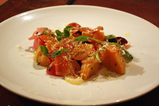 I started with a salad of cured steelhead trout ($12) that was a definite spot of brightness on that chilly, dark night. Roasted beets added sweetness, fresh horseradish a hit of fire and paper-thin slices of Persian lime bursts of citrusy refreshment.