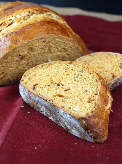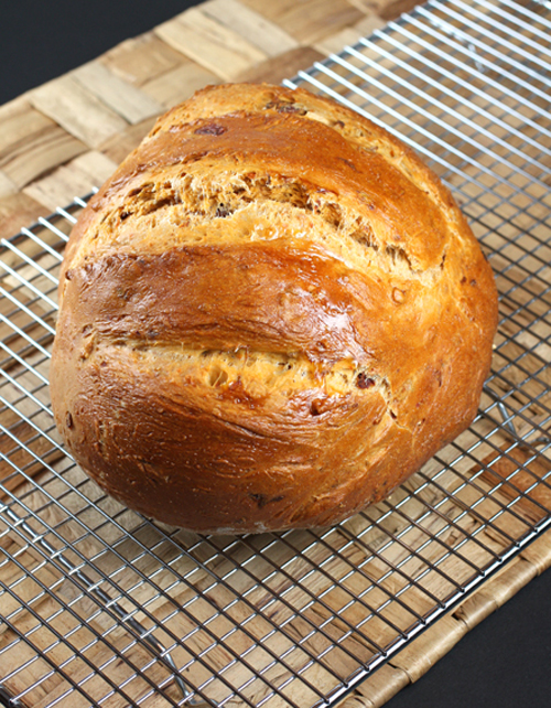 This bountiful round loaf is filled with chopped sun-dried tomatoes, so it bakes up with an orange-red crumb and a chewy-crisp crust.