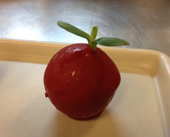 At Michael Mina in San Francisco, enjoy cherries in two unique savory preparations. First, the “Foie Gras Sphere” that is a tiny, rich mouthful of cherry and amarone-scented foie gras. It’s playfully shaped like a red sphere with a stem on top to mimic a real cherry. You’ll findΓΒ it as part of the “hors d’oeuvres platter” ($16).