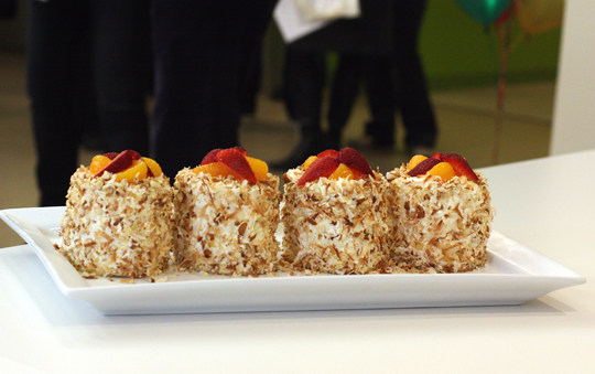 Finally, Carmell Childs of Utah created “Mandarin Tin-Can Tower Cake.” She used boxed cake mix to create a batter that was enriched with a can of Del Monte mandarin oranges (fruit, juice and all). The batter was poured into a jellyroll pan to bake. Then, cleverly using the actual empty can of Del Monte pineapple (with the top and bottom removed) as a cutter, she cut out circles of the baked cake, which were frosted with whipped topping mixed with the crushed pineapple, as well as instant coconut cream pudding mix. Three frosted circles were stacked on top of one another to form one adorable little cake, which was frosted again on top and all around the sides, before being showered with a mixture of toasted coconut and toasted chopped almonds.