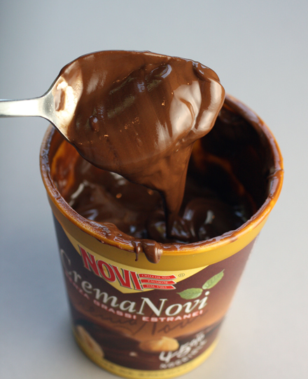 One look and one taste will show you the difference. Nutella is super thick. It won’t drip off a spoon. But Crema Novi, which doesn’t have the emulsifiers that Nutella does, will cascade off a spoon like melted chocolate. Nutella is quite chocolatey tasting. Crema Novi is unbelievably glossy looking, and tastes first and foremost of hazelnuts. It will floor you.