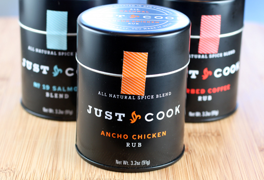 There are now six Just Cook spice blends: Herbed Coffee Rub, Any Day Chicken Blend, No. 19 Salmon Blend, Ancho Chicken Rub, Close to Curry Blend, and Gimme Steak Blend.