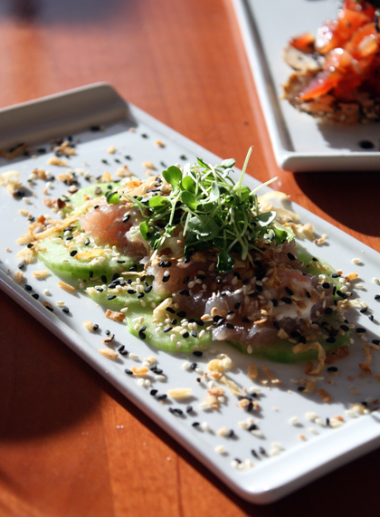 Another tuna preparation offers up the fish in a ring mold-formed tartare ($11). The dice of fish is mixed in with bits of avocado, scallions and kernels of corn for a vibrant California-style interpretation.