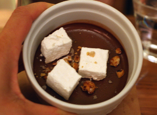 A chocolate pot de creme with marshmallows and candied hazelnuts.