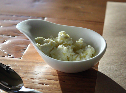 Ricotta with olive oil for spreading on Acme bread slices.
