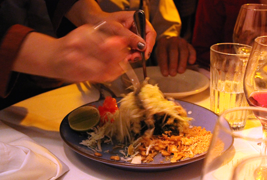 It comes to the table on a plate with little piles of fermented tea leaves, fried split roasted soybeans, fried garlic, toasted sesame seeds, tomato wedges, green cabbage and roasted peanuts. A dressing of garlic oil, lime juice and fish sauce is drizzled over as the whole thing gets tossed together. Chef Ong couldn’t find the requisite fermented tea leaves, so he made his own using Dragonwell green tea leaves that he soaked repeatedly to leech out much of the tannins, then squeezed dry before chopping.