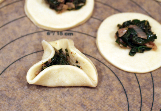 Cut out circles from the dough. Place a bit of filling in the center, then fold up the edges to form a pyramid or triangular shape. Brush with olive oil and bake.