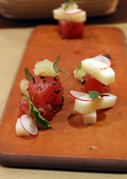 Ahi tartare ($16) arrived on a wood board as cubes arranged with green apple that gave a delightful burst of acidity. It’s a perfect dish to prime the palate for the entrees to come.