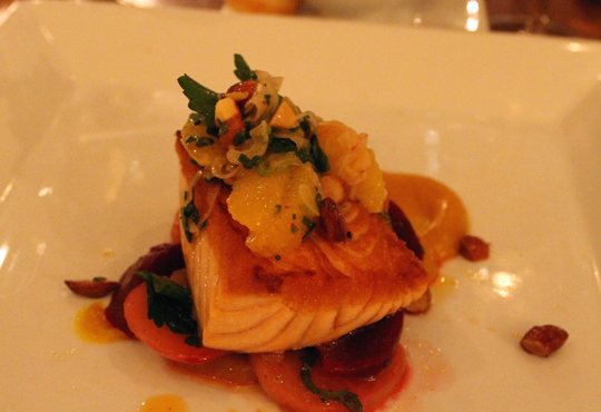 My entree was a dynamite roasted salmon with red and yellow beets, almonds and the most amazing puddle of thick orange-marmalade-like sauce I’d ever had. One of my colleagues longed to use it in a tart. I just wanted to lap up every drop.