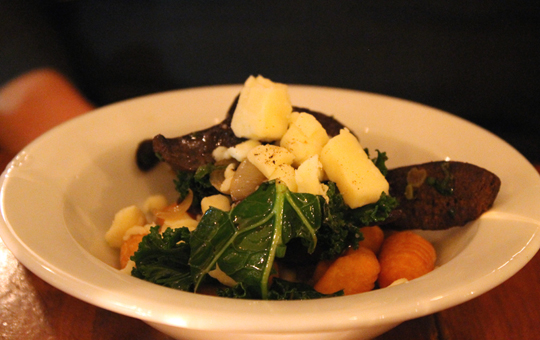 With six of us dining together that night, I had a chance to taste both first courses offered. We were all curious about the seal poutine. After all, it’s not every day that you see seal on a menu, not even in Montreal. This version of poutine — the famous Quebecois he-man dish of french fries, cheese curds and gravy — was reborn in a contemporary version with gnocchi instead and the seal fashioned into sausage. The sausage slices were quite tasty, but you couldn’t necessarily distinguish seal in it.