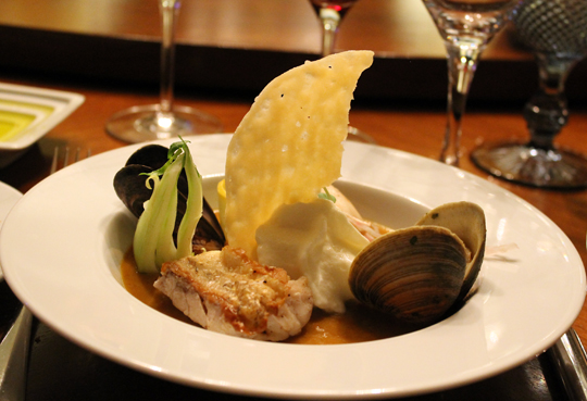 For my first course, I chose the “Gelee de Soupe de Poisson” or “fish soup jelly with garnishes.” I envisioned little, wiggly cubes of translucent jelly made from fish stock. But it turned out to be not what I expected at all. Instead, it was a shallow bowl of a thick, cold fish soup garnished wildly with seafood and bok choy. It was beautiful to behold, but fell short in taste and texture. It was as if you’d taken a pureed soup or sauce, stored it in the refrigerator overnight until it congealed, then served it just like that.