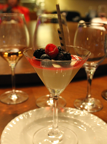 The finale was white chocolate mousse with fresh berries gone glam in a martini glass. The promised hit of absinthe in the mousse was quite faint, so much so that I wished there had been more of the anise-flavored spirit to really announce its presence.