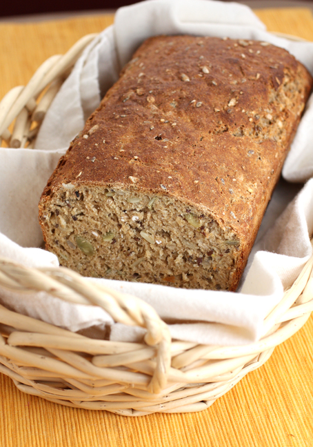 It bakes up with a crisp crust and a dense, but soft crumb. It’s very hearty tasting and the sunflower seeds add a nice pop of crunch. With its profusion of whole grains, this is a filling bread to nosh on. One slim slice for breakfast will definitely set you for the morning.