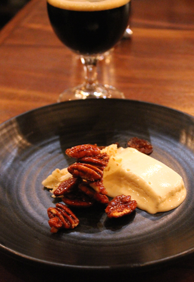 Dessert was an intriguing semifreddo made with smoked parnsip. Candied figs and candied pecans were strewn over the top of the frozen mousse. An oatmeal tuille added more nutty notes but will turn soggy if you don’t eat it first. Chicory Stout by Delaware’s Dogfish Head was the perfect finale. Made with Mexican coffee, roasted chicory, licorice root and St. John’s Wort, it reminded me of strong black coffee with its wake-me-up, dark roastedness.