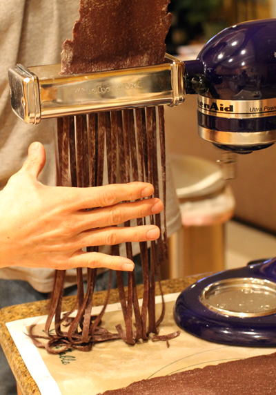 The pasta, which is not gluten-free because it does include some all-purpose flour, is the color of chocolate crossed with buckwheat, dark brown with a hint of purple to it.