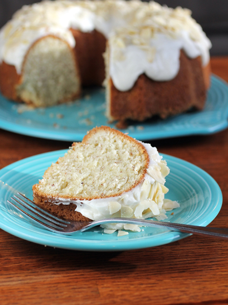 The glaze is a simple mixture of confectioners’ sugar, heavy cream, vanilla extract and almond extract. While the cake is mildly sweet, the frosting is definitely sugary. My husband suggested he might actually prefer a cream cheese frosting instead for its slight tang.