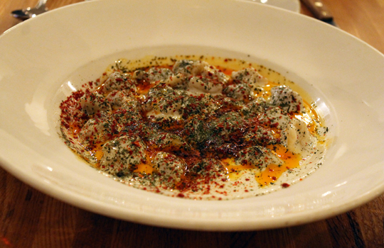 One of the signature dishes is the Turkish beef dumplings ($19) afloat in a thick sauce of yogurt with a plentiful amount of oregano. Paprika butter, with its dazzling color, is drizzled over to add a touch of heat. The dumpling skin, tender and thin, gives way to a tiny nugget of ground beef inside. It’s a little like Italian tortellini, but far richer.
