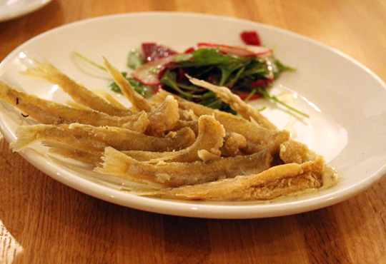 Fried smelts ($8) were a special that night. The small fish, coated in an almost tempura-like batter, crunched like potato chips and were as difficult to resist, especially when dipped into lemon tarator or tartar sauce.