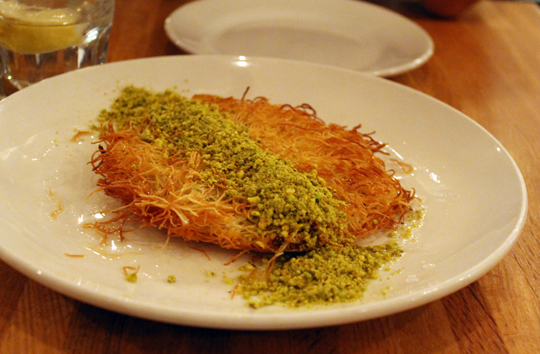 For dessert, enjoy the kunefe ($8), which takes 10 minutes to prepare. It’s worth it. It comes to the table looking like a veal cutlet. Shredded, golden shards of phyllo dough envelope a filling of house-made fromage blanc. Ground pistachios are sprinkled on all over the top. It’s quite buttery with the crunchy exterior giving way to the soft, mellow cheese underneath.