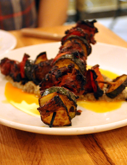 Marinated lamb kebab ($18) brings two hefty skewers holding cubes of charred lamb, onions and peppers on a bed of eggplant puree. The meat is smoky and tender. Squeeze on some lemon juice for just the right amount of acidity.