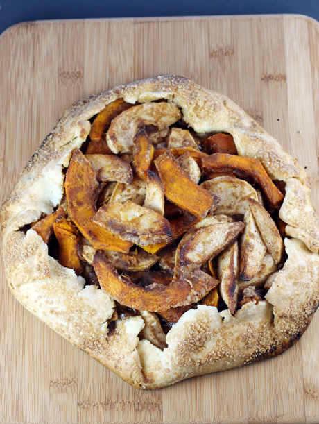 The dough is rolled out into a circle. You fill the center with slices of apples and pumpkin — or kabocha squash, as I used as recommended by the cookbook — that have been tossed with cinnamon, nutmeg, cloves, a dash of bourbon and sugar. Then, fold the edges of the dough over, before baking.