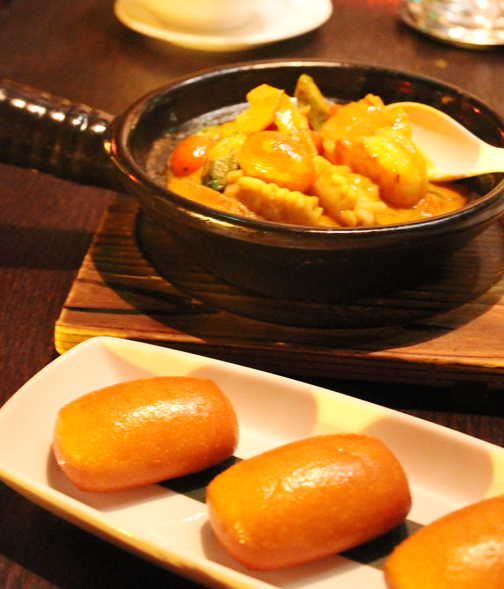 A claypot of Assam seafood ($29) brought a mix of prawns, squid, halibut and grape tomatoes in a mild, creamy curry sauce you want to ladle over rice. While no steamed buns or pancakes accompany that aforementioned dish of pipa duck, the seafood curry does come with Chinese buns. Fried, they arrive with a shine of oil on the outside and are as sweet as doughnuts. Too sweet, actually. Had the curry been more fiery, the sweetness of the buns might have been more appropriate.