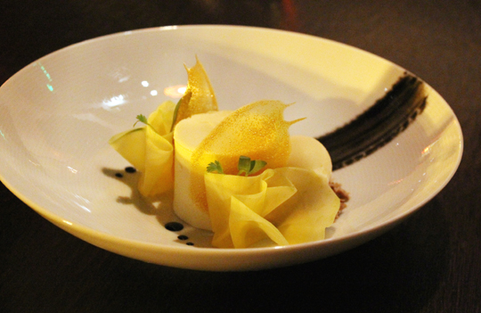 Dessert is actually less sweet and quite lovely. A cylinder of white chocolate mousse mango cake ($10) was garnished with mango slices, furled like flower petals around it. A mango gel is hidden inside the layer of cake. A paint brush stroke of black sesame on the plate adds a dash of deep nutty earthiness. A quenelle of yuzu ice cream has a refreshing tart-floral flavor along with tiny morsels of champagne gelee.