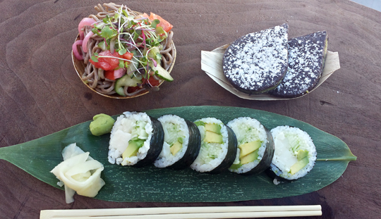 Each three-course lunch is $15. Selections change daily but include a savory sushi roll, salad and home-made dessert — all packaged to take along with you.