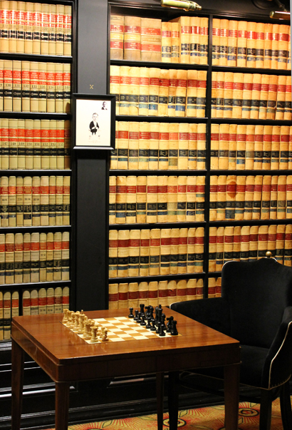 The lobby boasts a clubby library room complete with well-appointed bookshelves and a chess set.