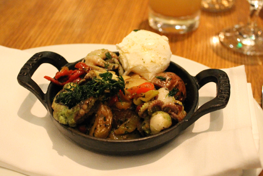 Grilled octopus ($15) comes to the table in an individual cast-iron pan. It’s Spain meets California — loaded with tender, smoky pieces of octopus and creamy marble potatoes, all flavored with the brightness of blood orange and heat of pepperoncini.