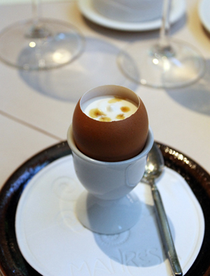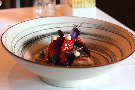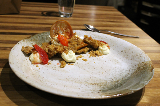 It was arranged all on the far edge of a plate, as is the trend these days of so many chefs to play up negative space in presentations. It’s a little Persian-like in flavor with the strong orange and almond flavors evident in the fresh blood orange segments, dehydrated orange chip, and chopped, toasted salted nuts. On the bottom was a crumble of cake with some pieces tender and others a little crunchy. With dollops of fromage blanc, it was kind of like a glam version of breakfast if you’re used to yogurt, fruit and granola in the morning.