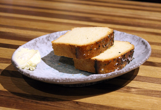 Slices of brioche are presented with herb butter finished with flecks of sea salt. The brioche looks a little like pound cake and tastes as buttery, but its texture is delicate and light.